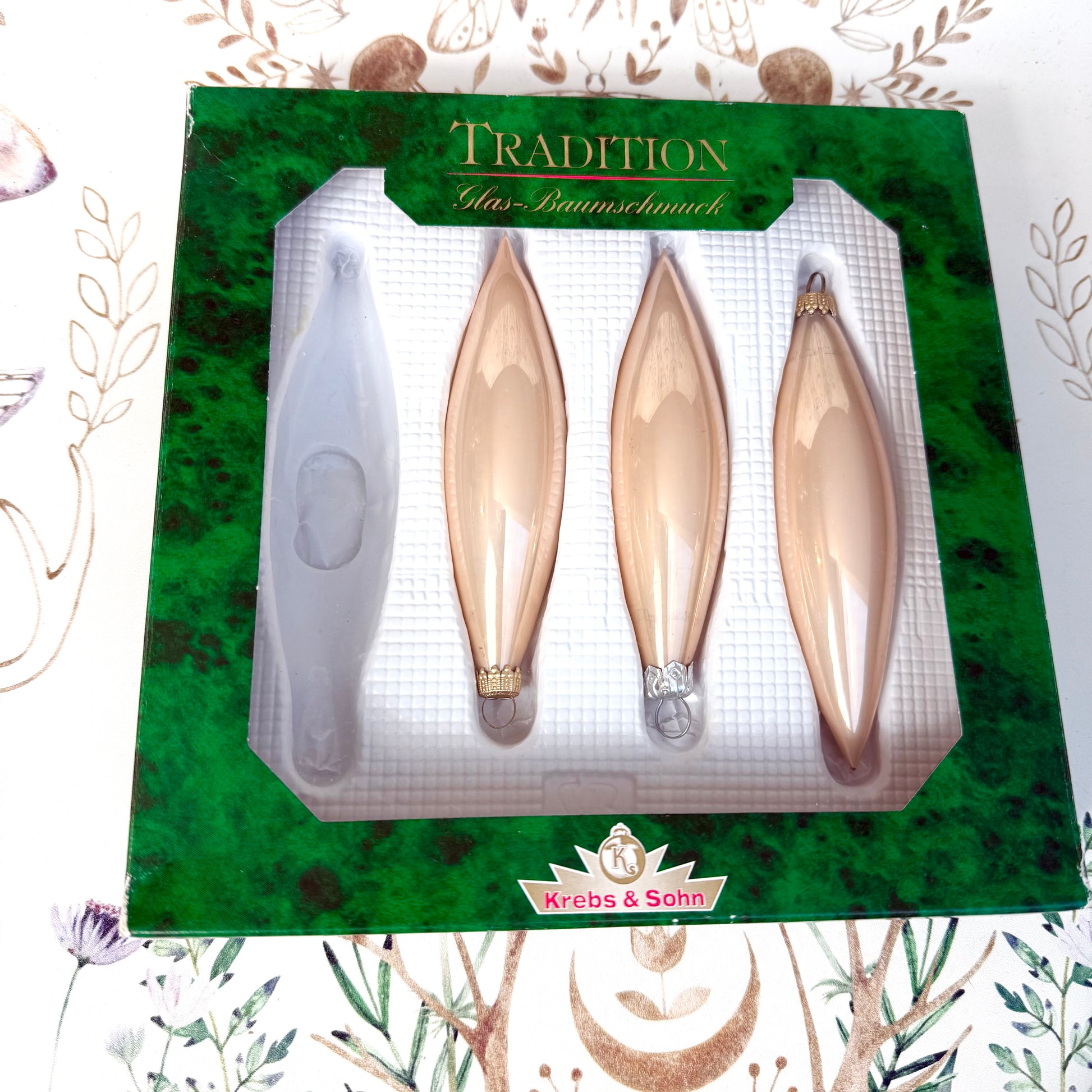 Du liebst handgemachte Unikate und einzigartige Vintage Stücke? Dann ist dieser Lauscha Christbaumschmuck genau das Richtige für dich! Der champagnerfarbene Glasschmuck in Tropfenform ist zeitlos wie elegant. Also, worauf wartest du? Sichere dir dieses besondere Set, solange es noch da ist!