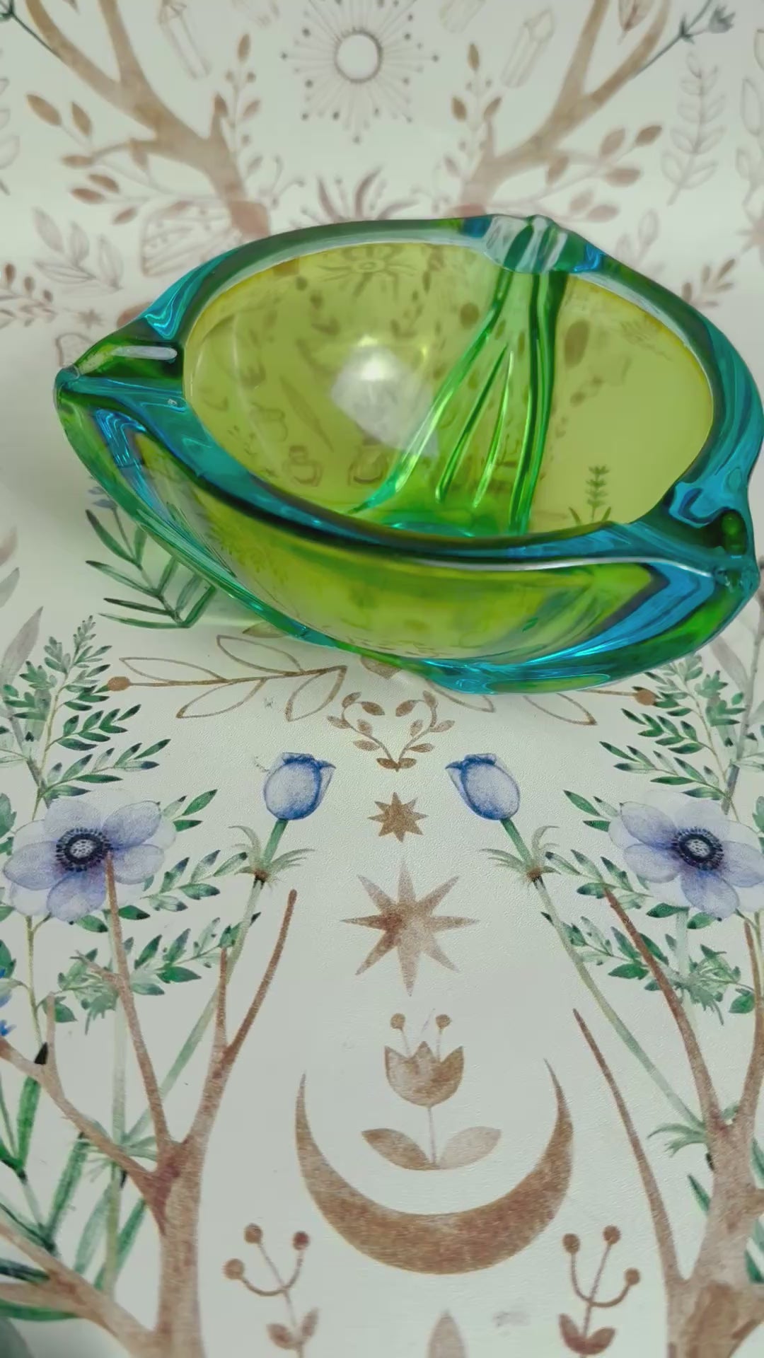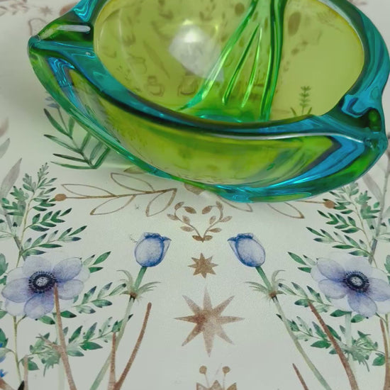 Du bist leidenschaftlicher Sammler antiker Unikate und wertvoller Vintage-Fundstücke? Dann ist dieser farbenfrohe Glas Aschenbecher genau das Richtige für dich! Die Schale in wundervollem Grün und Blau ist ein echter Blickfang. Die geschwungene Form und ihr perfekter Farbverlauf machen sie zu einem optischen Highlight, das Sammlerherzen höher schlagen lässt. Perfekt als Ausstellungsstück für die Vitrine, als Tischdeko oder für die Aufbewahrung von Schmuck und anderen kleinen Alltagsgegenständen. Also, worauf wartest du noch? Hol ihn dir so lange du noch kannst!