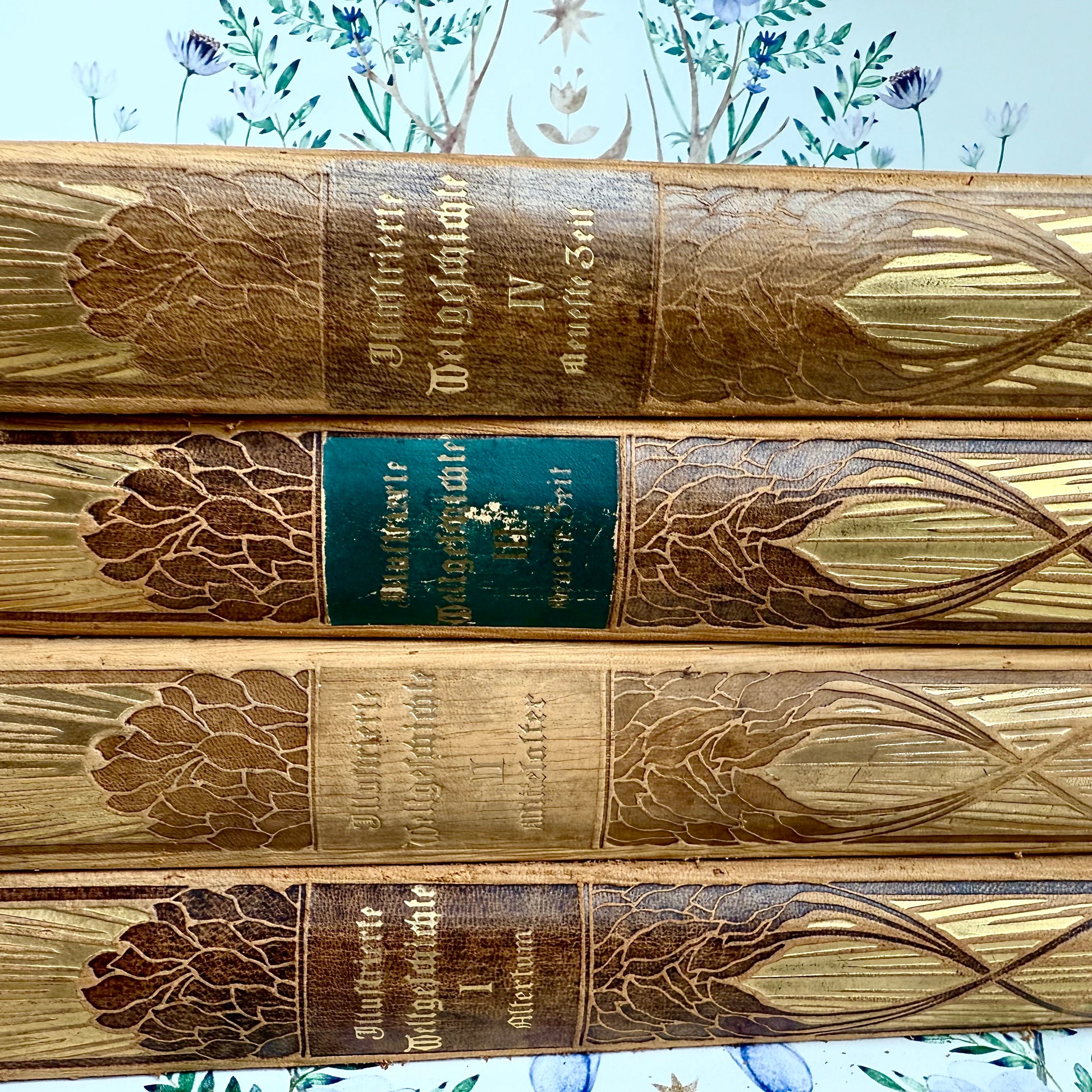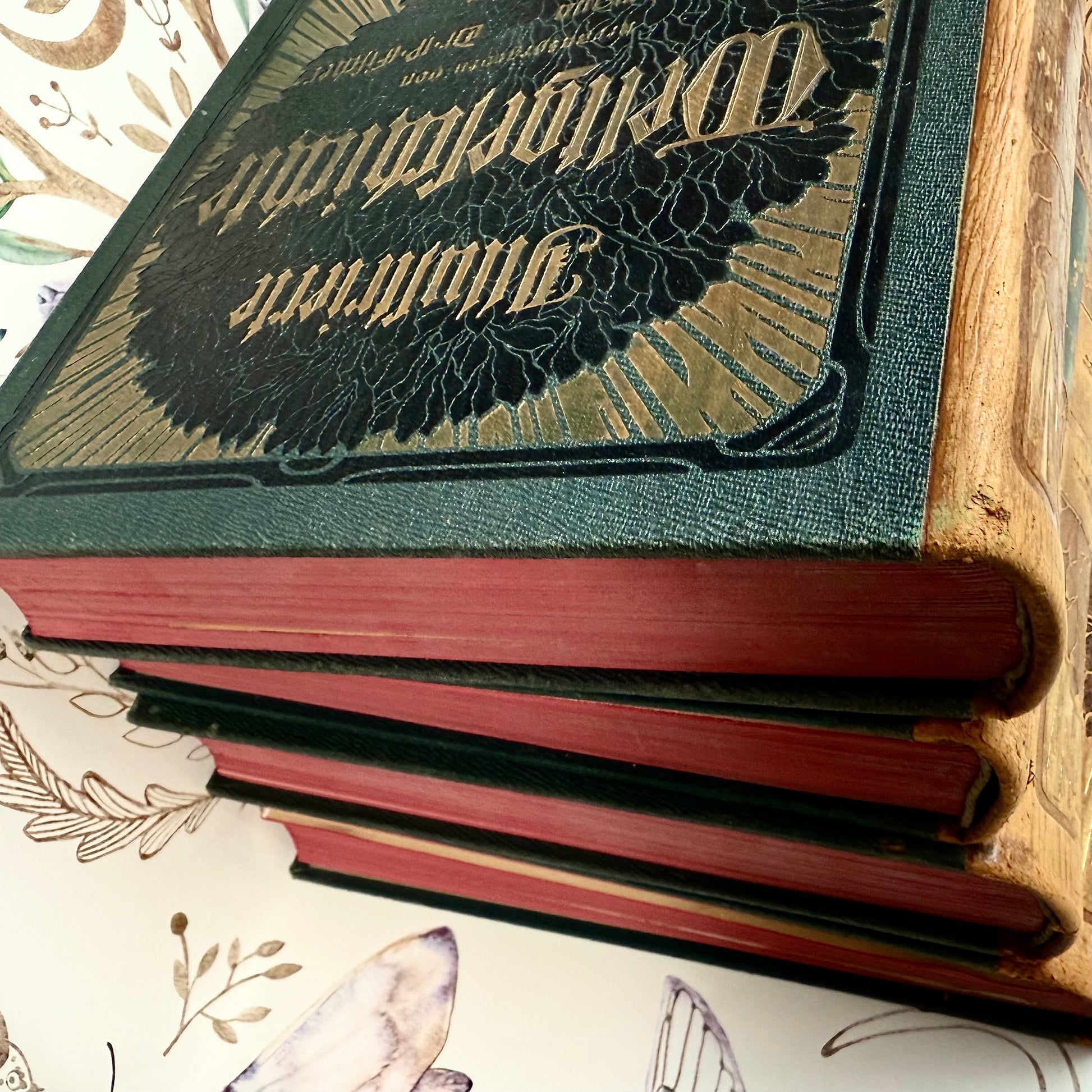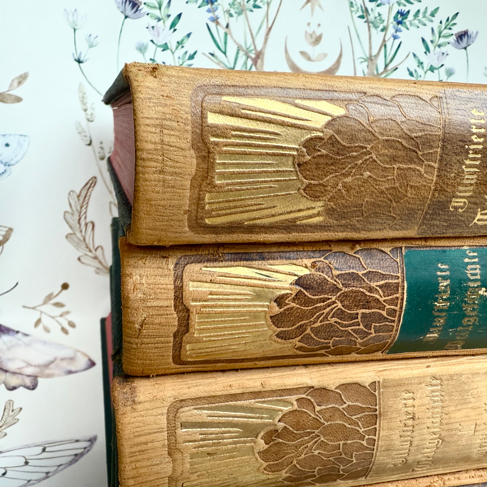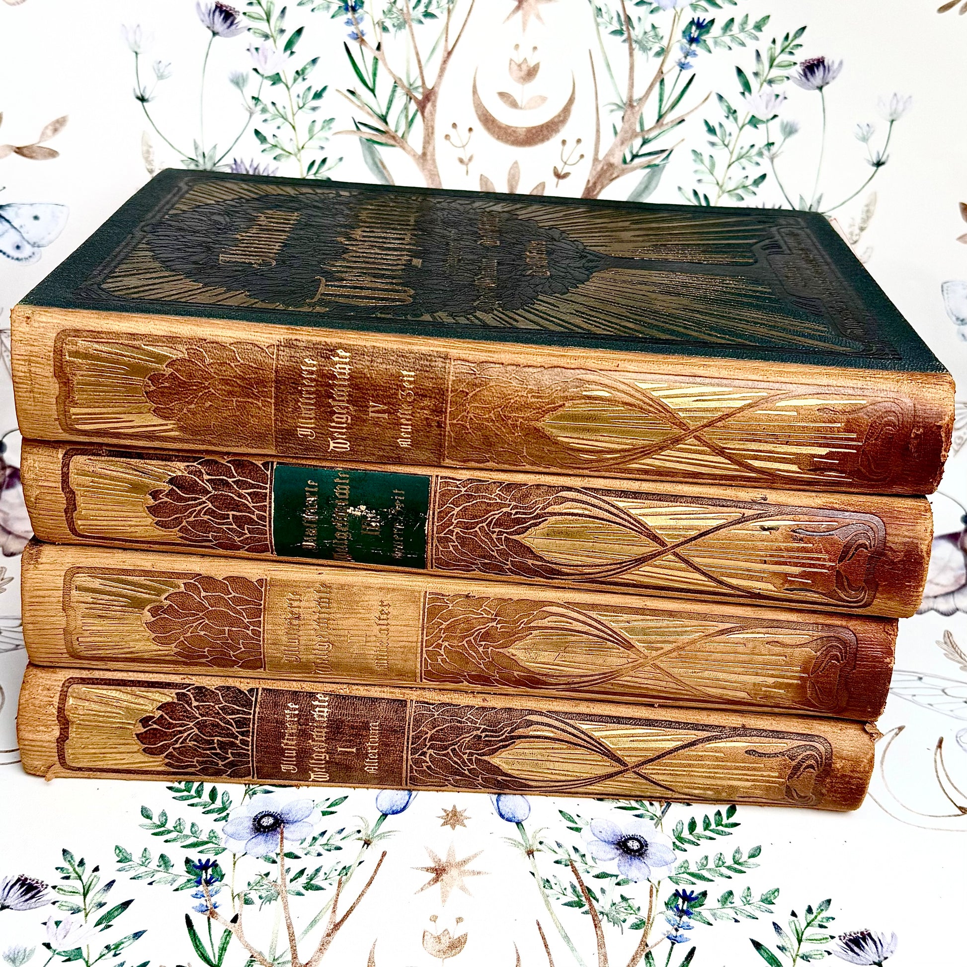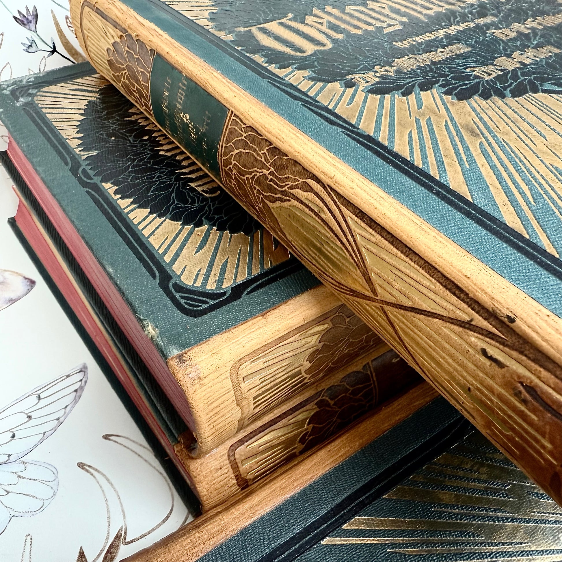 Bist du auf der Suche nach einem absoluten Schmuckstück für dein Bücherregal? Dann wirst du dieses Set antiker Bücher lieben! Die prunkvollen Jugendstil Bücher in gold enthalten zahlreiche Illustrationen und Dokumente, wodurch sie dein Bücherregal im Handumdrehen in eine Dark Academia Bibliothek verwandeln werden. Also, worauf wartest du noch? Hol sie dir solange du noch kannst!