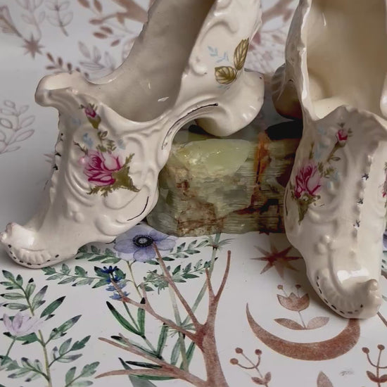Du bist leidenschaftlicher Sammler seltener Unikate und einzigartiger Vintage-Fundstücke? Dann sind diese filigranen Skulpturen genau das Richtige für dich! Die reichlich verzierten Schuhe mit ihren Schnörkeln sind ein echter Blickfang und ein optisches Highlight, das Sammlerherzen höher schlagen lässt. Ob als Deko auf dem Kleiderschrank, als Ausstellungsstück für die Vitrine oder als originelle Tischdeko - die kuriosen Keramiken im Shabby Chic Stil werden alle Blicke auf sich ziehen. Also, worauf wartest du noch? Hol sie dir so lange du noch kannst!