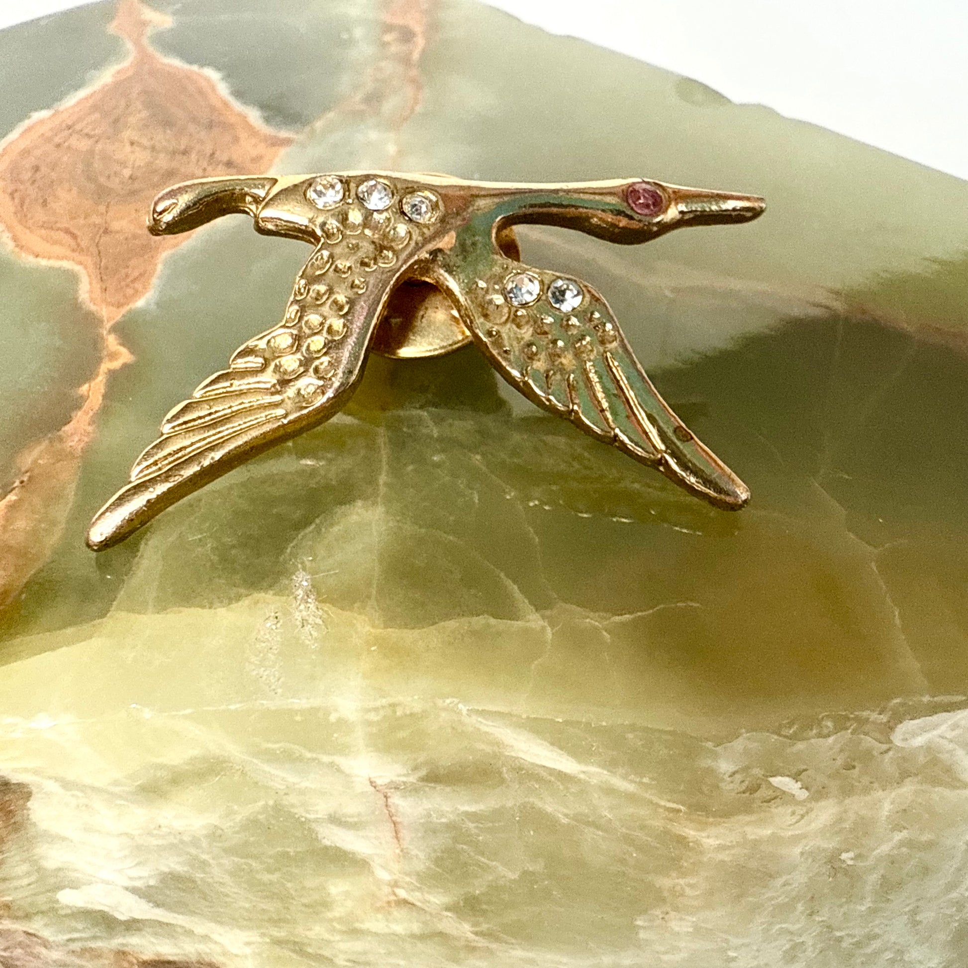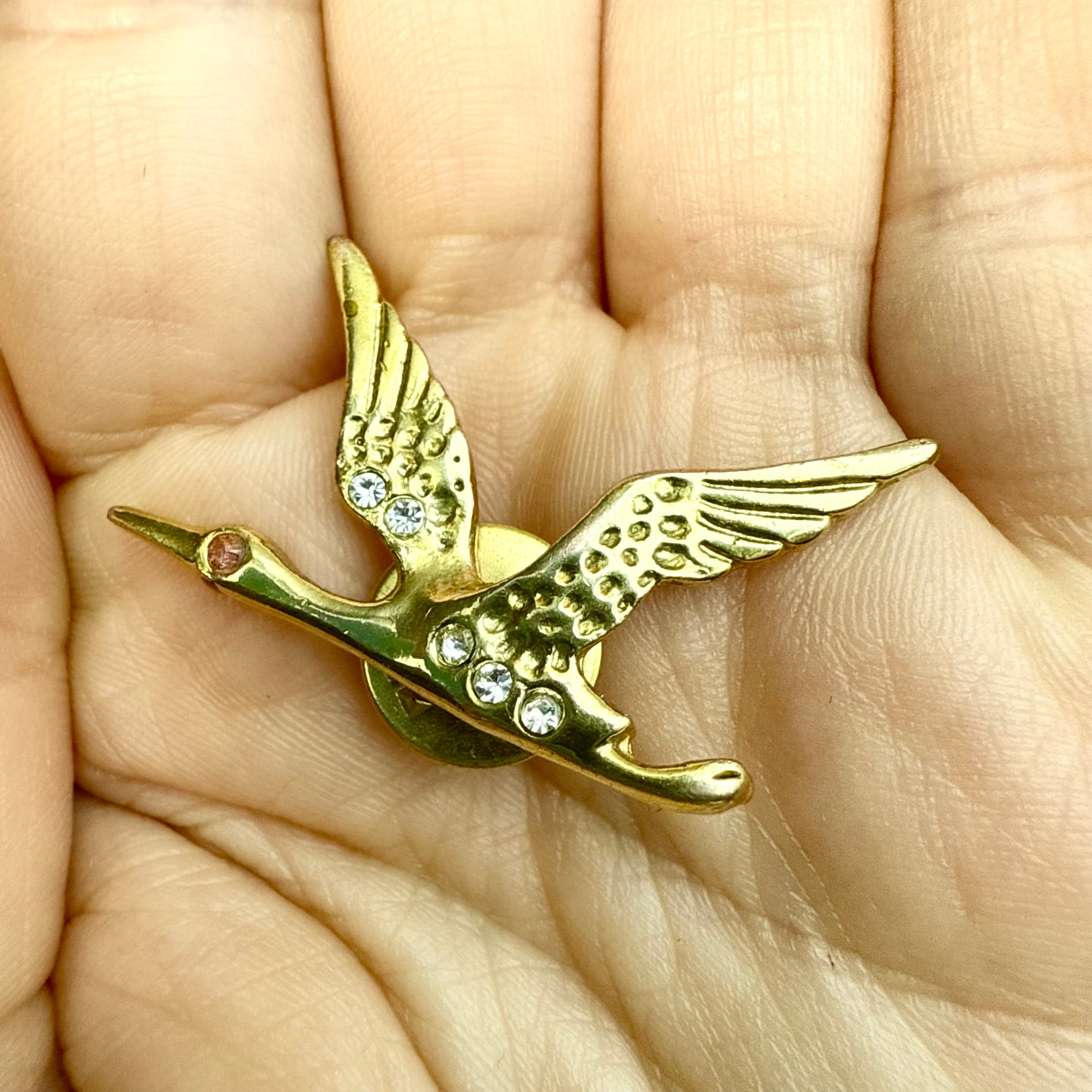 Du magst besonderen und einzigartigen Vintage Schmuck? Dann ist diese goldene Brosche eines Kranichs oder Schwans genau das Richtige für dich! Der Pin ist ein wahrer Hingucker und ein perfektes Accessoire für sowohl schlichte als auch extravagante Outfits. Also, worauf wartest du noch? Hol sie dir so lange du noch kannst!