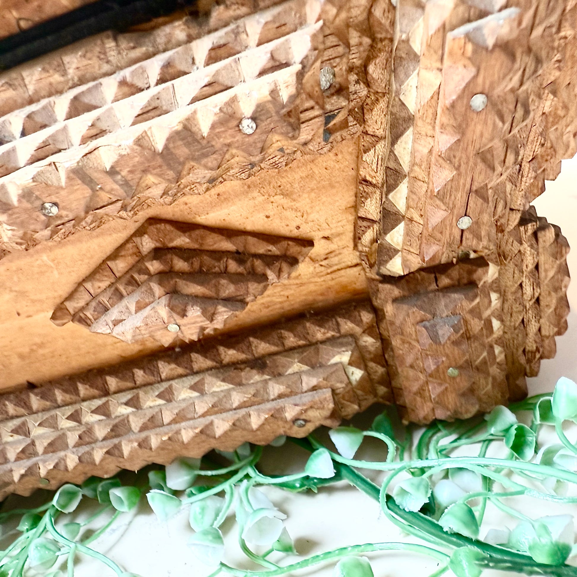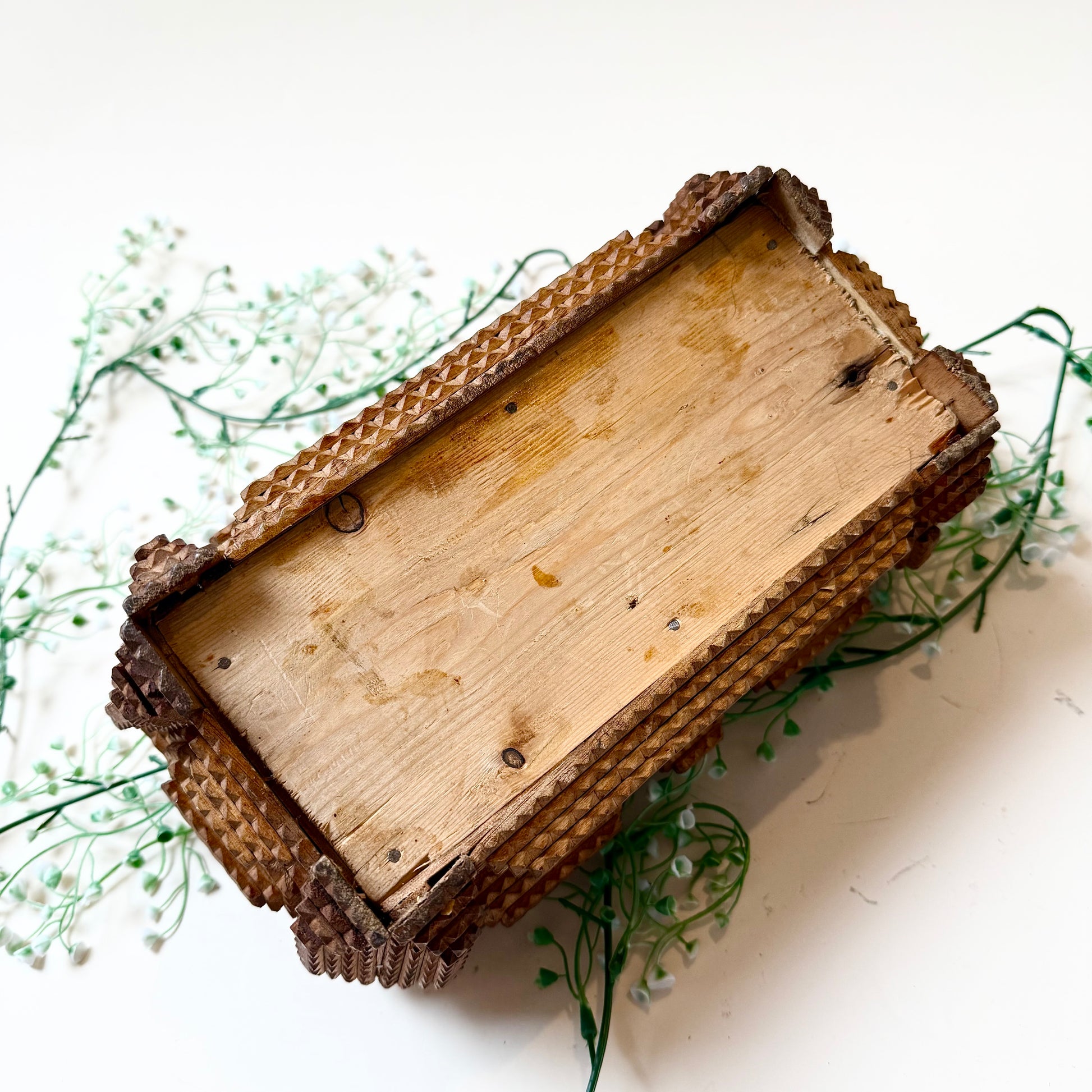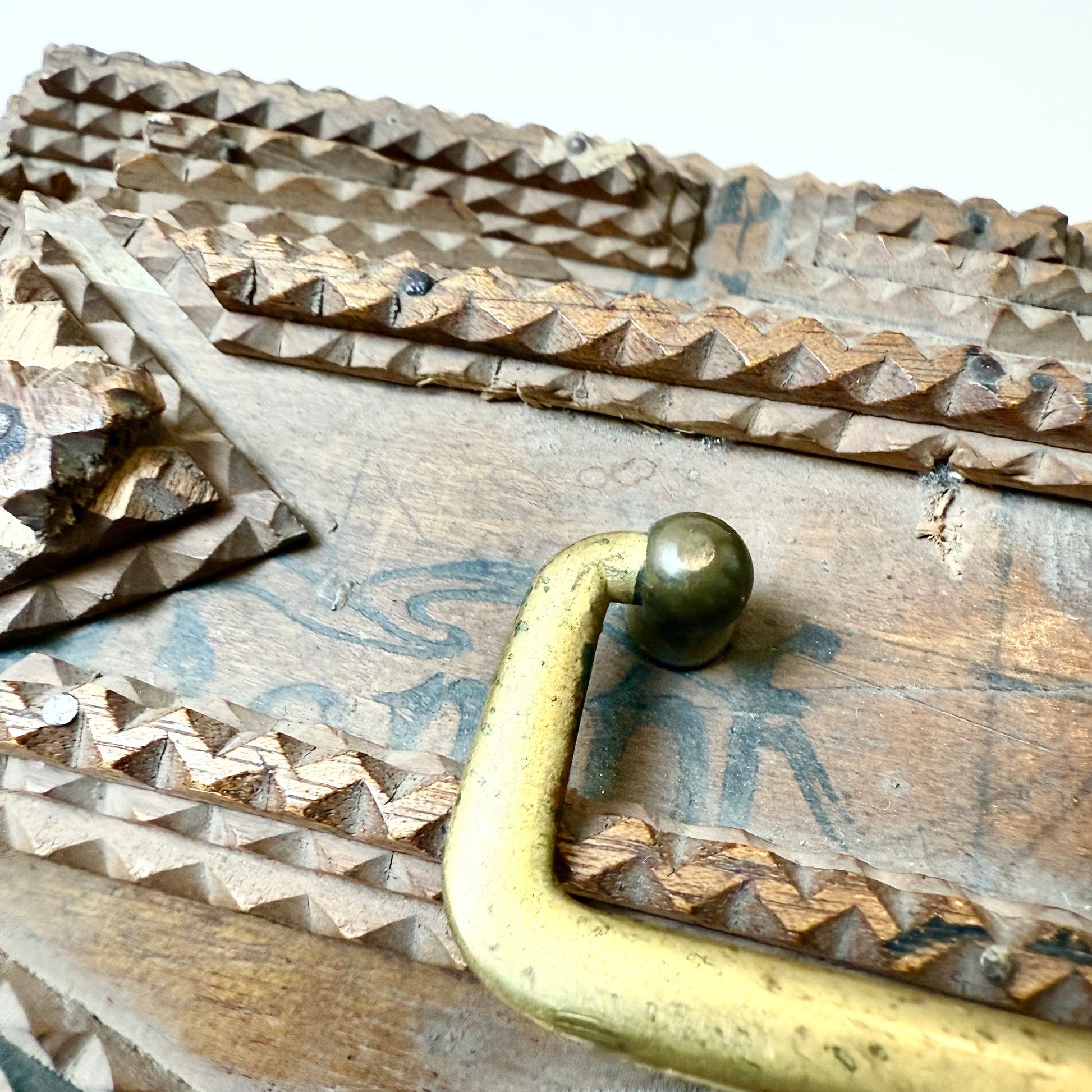 Du bist leidenschaftlicher Sammler antiker Tramp Art und besonderer Vintage Stücke? Dann ist diese originale Tramp Art Box genau das Richtige für dich! Die handgemachte Truhe mit ihren zahlreichen Schnitzereien ist ein absolutes Highlight und perfekt um Schmuck oder andere kleine Alltagsgegenstände aufzubewahren. Also, worauf wartest du noch? Hol dir die Antiquität so lange du noch kannst!
