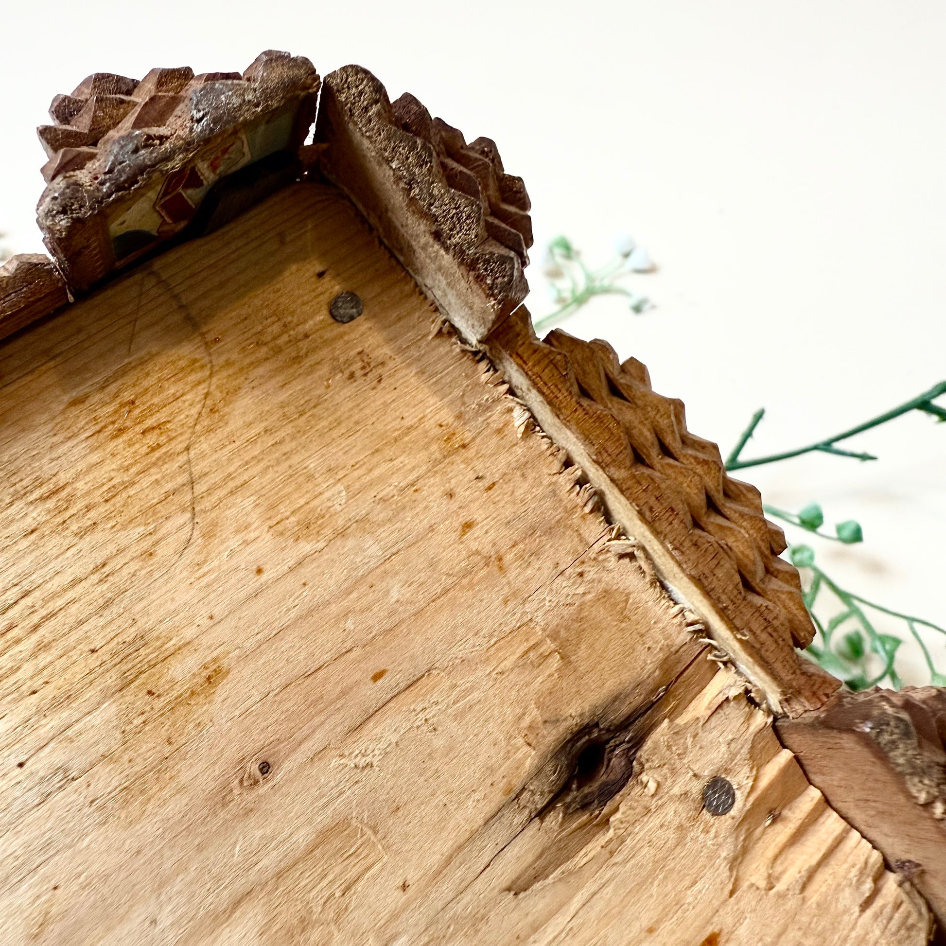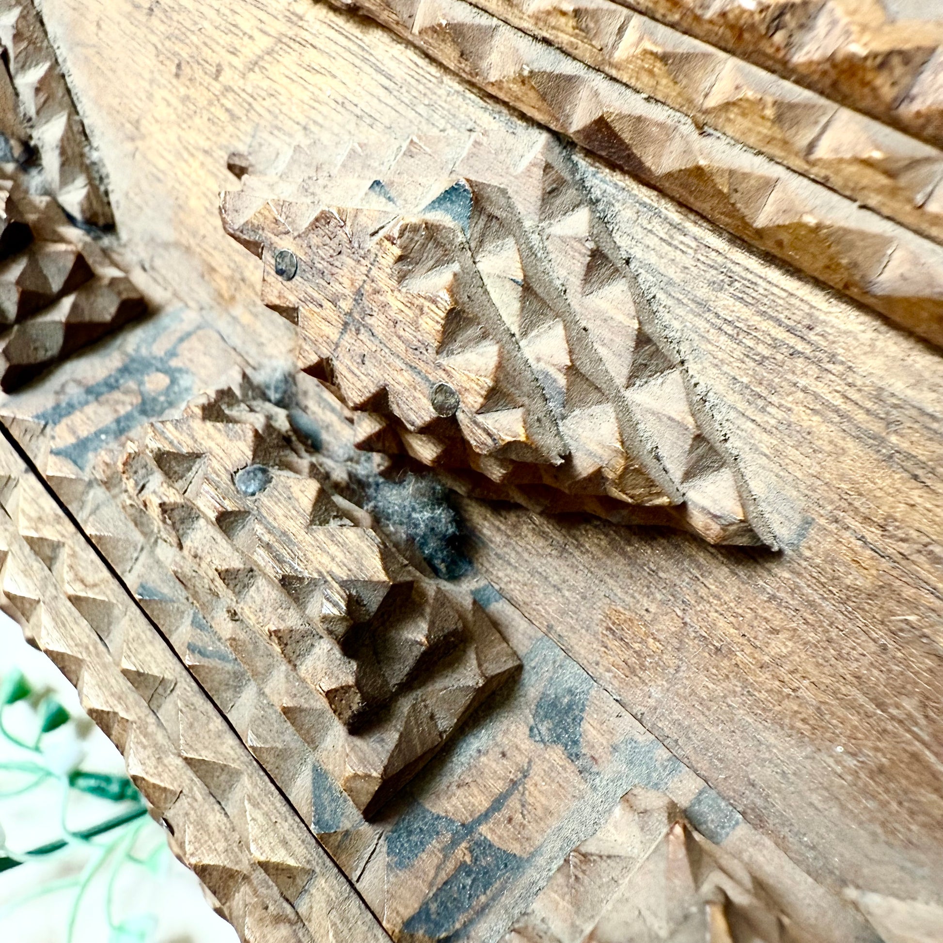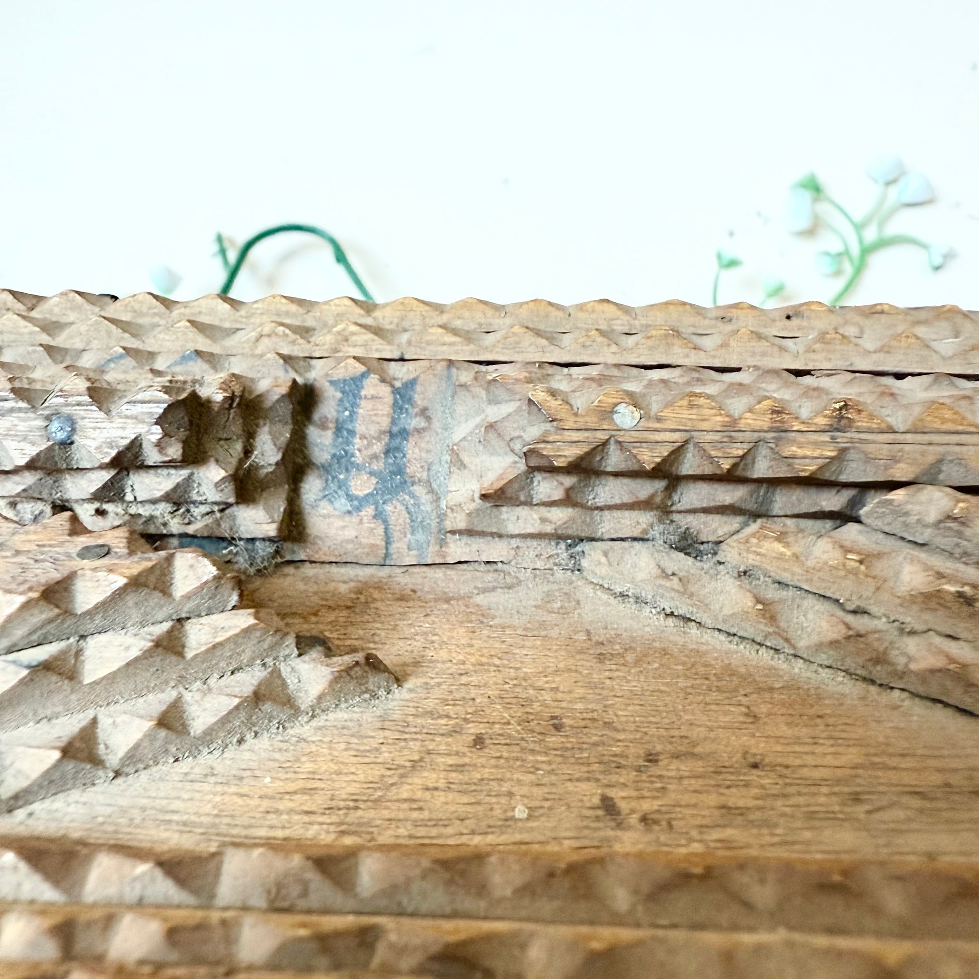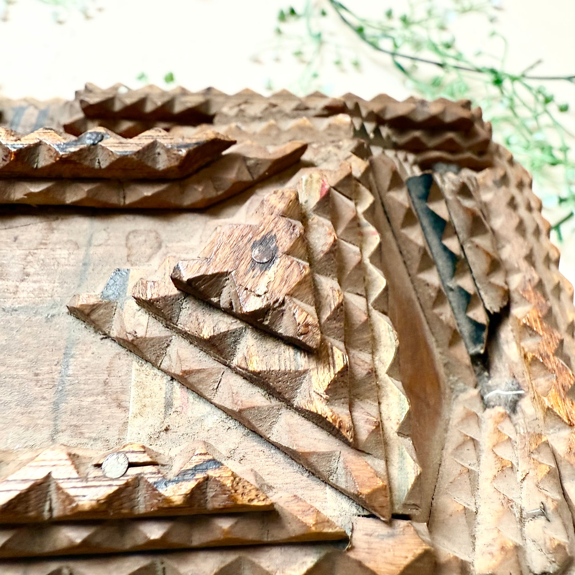 Du bist leidenschaftlicher Sammler antiker Tramp Art und besonderer Vintage Stücke? Dann ist diese originale Tramp Art Box genau das Richtige für dich! Die handgemachte Truhe mit ihren zahlreichen Schnitzereien ist ein absolutes Highlight und perfekt um Schmuck oder andere kleine Alltagsgegenstände aufzubewahren. Also, worauf wartest du noch? Hol dir die Antiquität so lange du noch kannst!