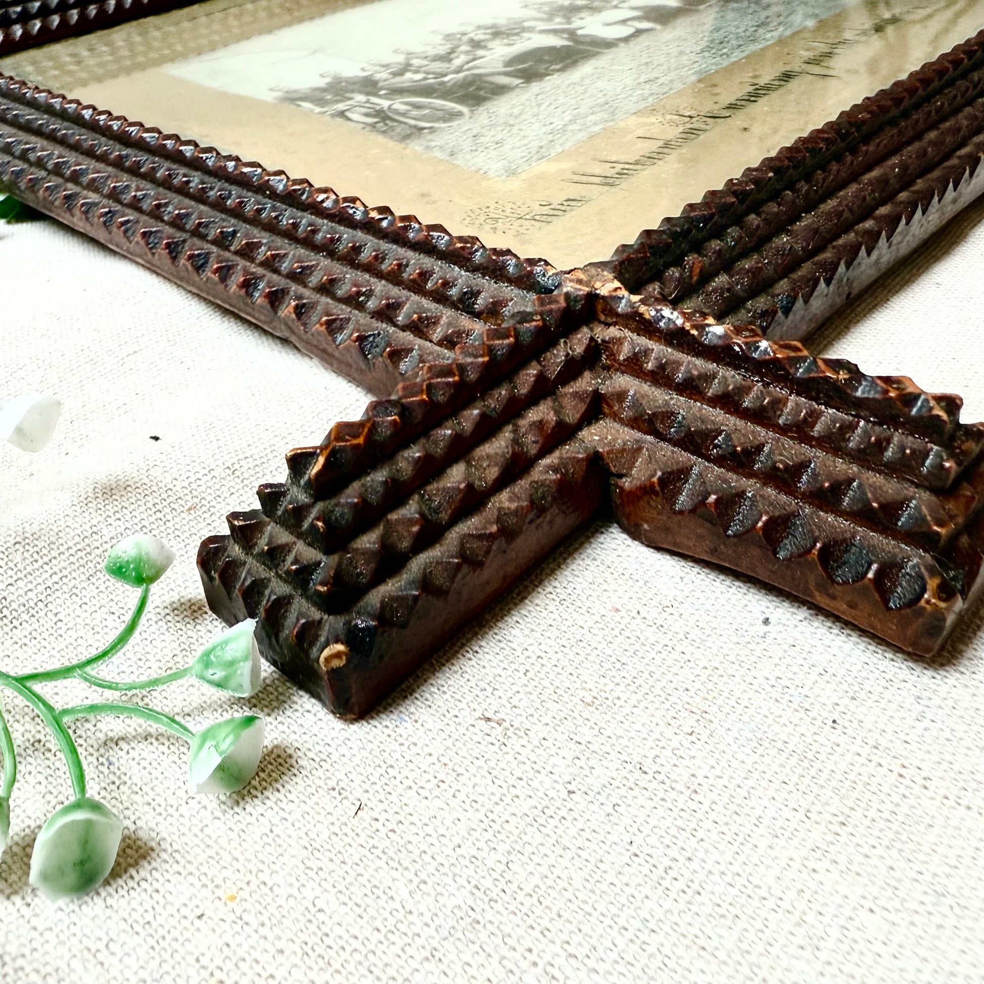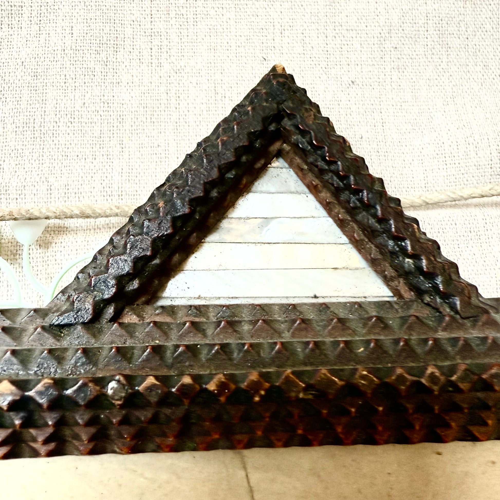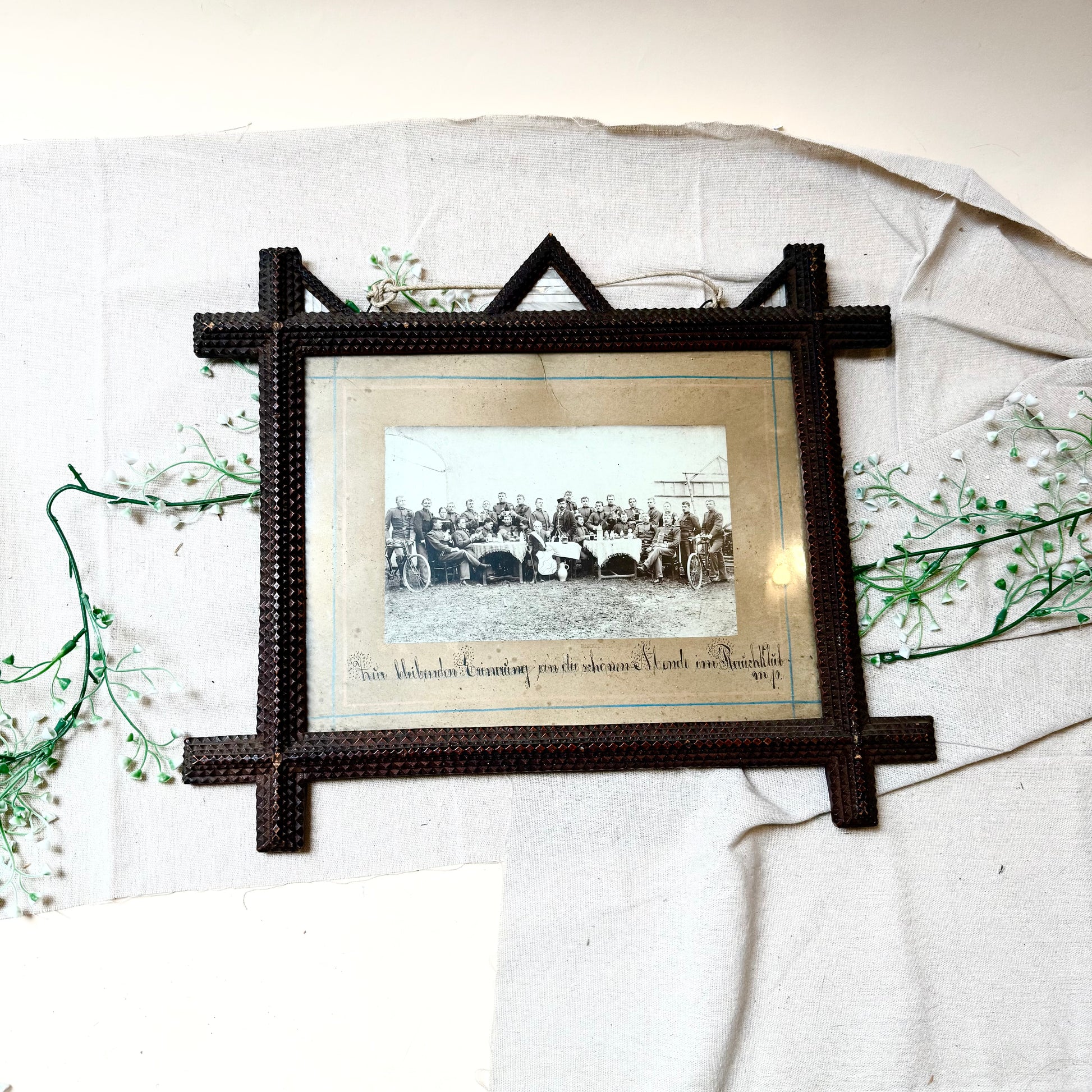 Du bist leidenschaftlicher Sammler antiker Tramp Art und besonderer Vintage Stücke? Dann ist dieser originale Tramp Art Bilderrahmen mit Perlmutt genau das Richtige für dich! Der handgemachte Holzrahmen mit seinen zahlreichen Schnitzereien ist ein absolutes Highlight und Sammlerstück. Also, worauf wartest du noch? Hol dir die Antiquität so lange du noch kannst!